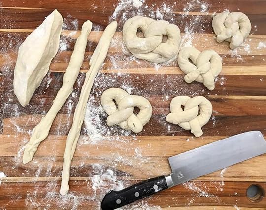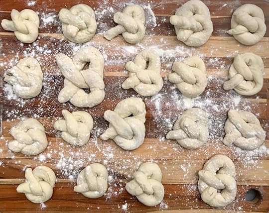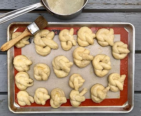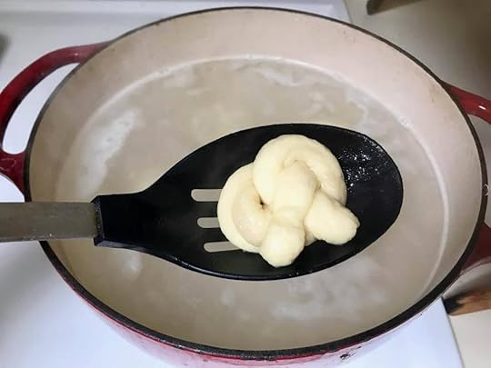 A bath of simmering water with baking soda helps turn them from plain old dough knots into shiny yellow pretzels when you bake them.