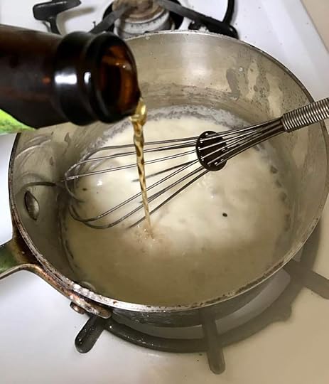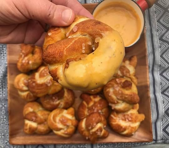 I can't contribute much football spirit to the game, so I'll be doing what I do best: making something good to eat while we watch grown men who make more money than the GNP of small countries beat each other up. More specifically: soft pretzels with gooey IPA cheese sauce for dipping. Here's what that looks like.