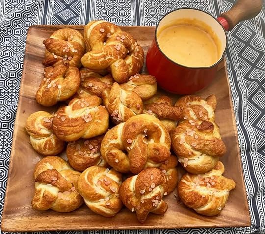 After about 30 minutes, the pretzels are ready to eat. I like to keep the sauce warm by serving it in a metal pot.