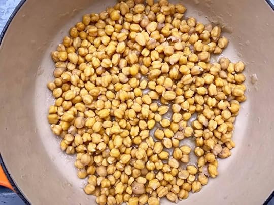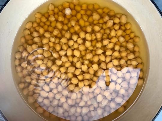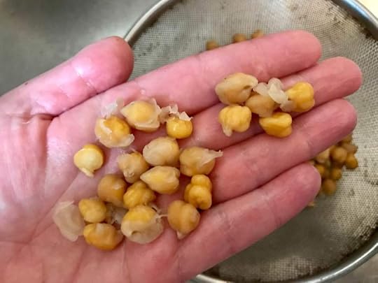 If you have the time, soak them overnight, with some baking soda. If, like me, you are less patient, do the quick soaking method and stir some baking soda into the chickpeas and water, simmer for a few minutes, then cover for 10 minutes. This helps loosen the peels, and as you will find, this is the key to the smoothest, creamiest hummus.