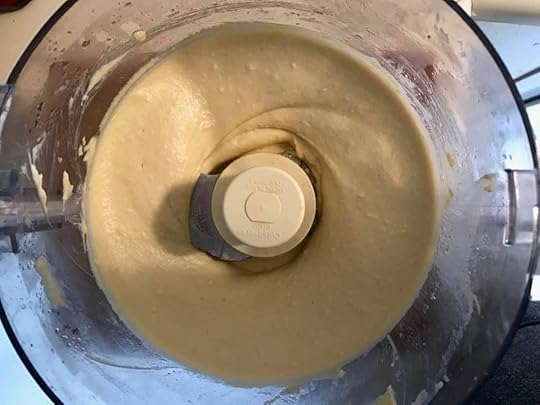 After cooking for a long time, it's into the food processor with tahini, olive oil, lemon, garlic, and salt.