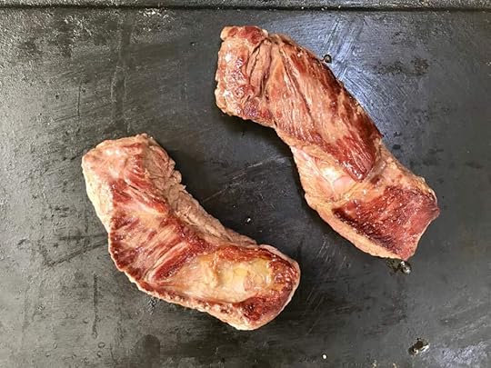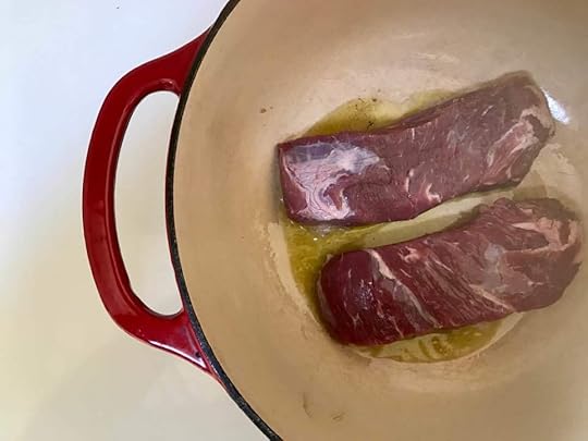 I'm starting by searing about a pound of boneless short ribs (the kind with bones in are fine too, just double it to 2 pounds) in a little olive oil in a Dutch oven.