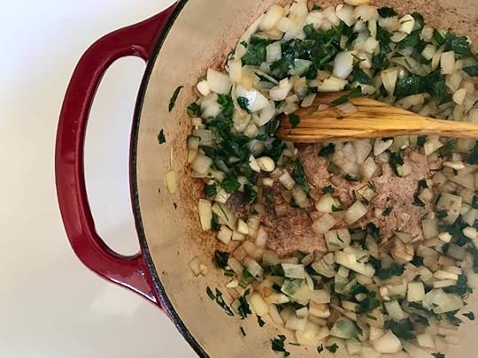 Next, like any ragu, we're going to cook some vegetables. Here, we're going with aromatics: onion, lots of parsley, and garlic.