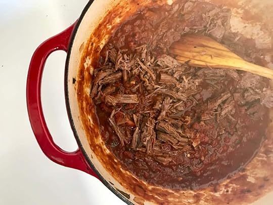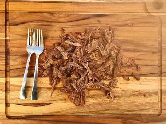 3 hours later, the sauce is cooked down and the short ribs are falling apart, and out they come. These are so tender, you barely have to pull the forks into the meat.