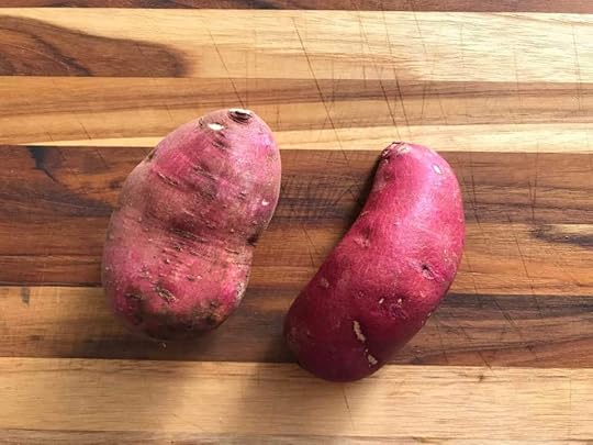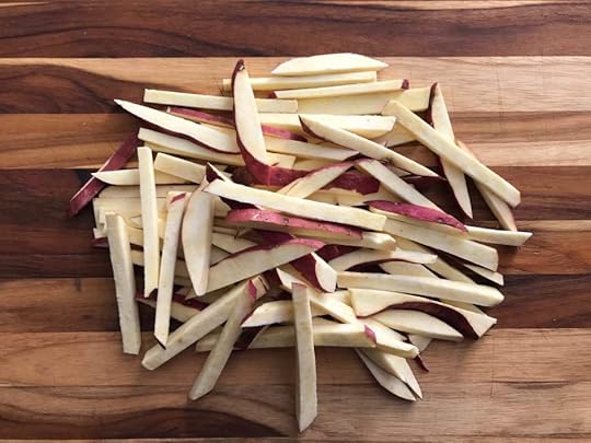 I'm sure you're not surprised to learn that recipes and ingredients fall into the crushable category as well (remember my cauliflower obsession of 2015?). I tend to discover a dish or ingredient, and then cook it over and over again until I'm either sick of it (almost never happens) or I feel like I've perfected it. My current food crush is these garlicy sweet potato fries. Instead of the orange-fleshed garnet yams I usually use, I'm using the sweet potatoes I just cannot get enough of lately: purple-red skinned, beige-interior Japanese sweet potatoes (which are very good for you, and will apparently make you as beautiful as Olivia Munn's BTW). These have the sweet, nutty flavor of yams, but the baking integrity and firmness of regular potatoes, making them the most perfect oven fry sweet potato, in my opinion.