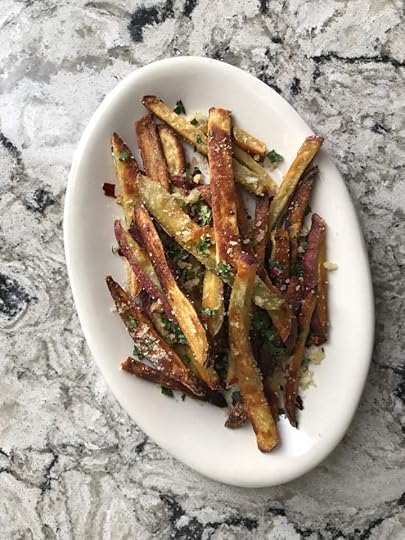 I toss them with the fixings of the ball park garlic fries my dad and I used to share at baseball games (because like all of my crushes, they remind me a little bit of my father): another drizzle of extra virgin olive oil, a touch of salt, chopped raw garlic, parsley, and Parm.