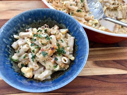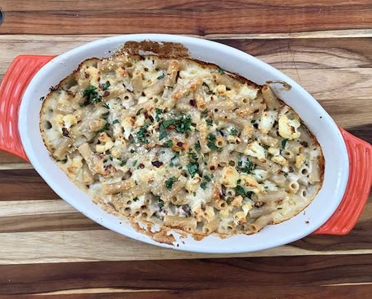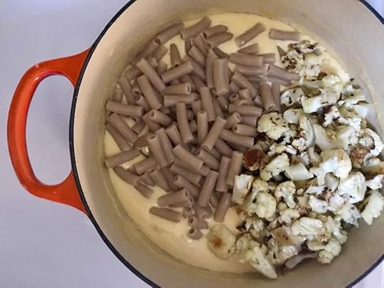 This is not some bullshit low-fat sauce, nor do I deign to suggest that cauliflower is a reasonable substitute for pasta. I would never insult you like that. This contains both a decadent, legit cheese sauce and real macaroni--it's just tempered with a hefty dose of roasted cauliflower. It's not "healthy" per se, but it's a whole lot more so than the regular stuff. Also, because cauliflower contains so much sating fiber, you may find (as I did), that one smallish bowl is all you need.