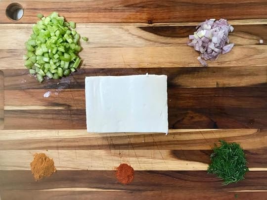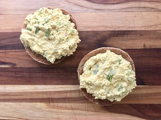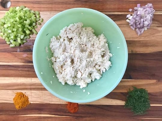 Eggless egg salad is one of my favorite quick vegetarian protein sources, even to this day. It starts with soft tofu (you could use medium or firm tofu, but it won't have that egg-white-like texture, plus celery, shallot (you could use regular or green onions too), fresh dill, plus cayenne for spice, and turmeric for flavor and egg-like color.