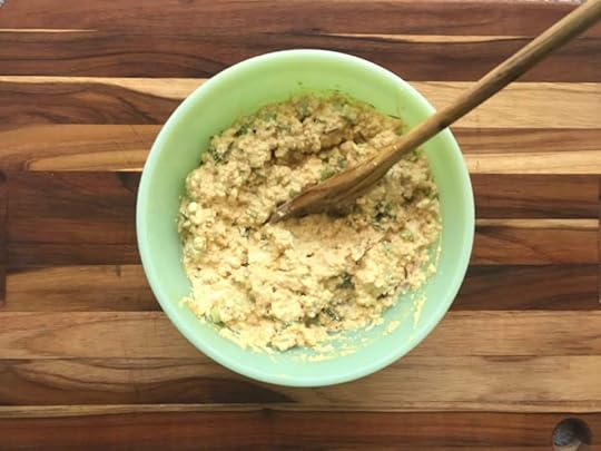 You smush up the tofu so it looks like crumbled hard-boiled eggs. This part is fun.