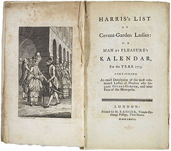 Harris’s List of Covent Garden Ladies ( published from 1757 to 1795)was a printed directory of London Prostitutes that sold about 8,000 copies annually. Each edition described in erotic prose, often in lewd detail, the physical attributes and sexual specialities of over one hundred prostitutes who worked in and around Covent Garden. Although the list is named after Jack Harris who was the head waiter at the popular Shakespear’s Head Tavern in Covent Garden, Irish poet Samuel Derrick is now credited as being the true genius behind the book. Many modern critics view Harris’s List as an early form of erotica.
