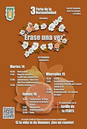 El día de hoy inició un evento en la Facultad de Ciencias Administrativas y Sociales (FCAyS). Es la 3ra. feria de la normatividad y su tema es la promoción de la lectura. Daré una breve plática de una hora el día de mañana, a las 11 a. m. sobre el fomento a la lectura a través del cuento. Será en el aula D10 de la facultad. Estará interesante, si tienen tiempo asistan y nos vemos ahí.