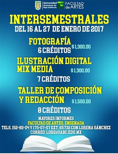 A través de este medio los invito a un curso de redacción que impartiré en la Facultad de Artes de la UABC, en Ensenada. Dentro del curso veremos ejercicios prácticos sobre redacción creativa y académica. el costo es de $1500 pesos y la duración de dos semanas, a partir del 16 de enero. El horario es vespertino, de 3 a 7 p. m. Están cordialmente invitados, será muy divertido.