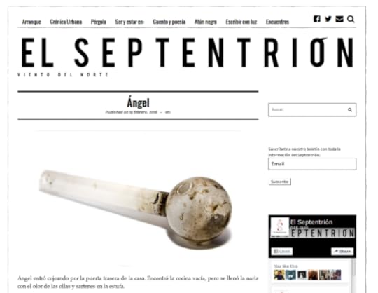 Estoy muy feliz porque me publicaron un cuento en la revista norteña "El Septentrión", editada por Asael Arroyo. Es un cuento que escribí en el 2013 y estuvo enlatado mucho tiempo. Pero por fin sale a la luz del día. El título es "Ángel". Hagan click en este link para leerlo.