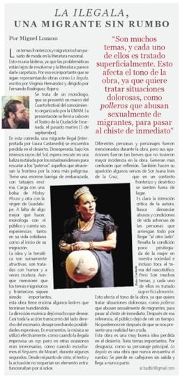 La idea y la temática son sumamente atractivas, son tratadas con humor y a veces crudeza. Aunque mencioné que los temas migratorios y fronterizos siguen siendo importantes, esta obra tiene encima algunos lastres que terminan hundiéndola. La dirección escénica dejó mucho que desear. Casi toda la acción transcurrió del lado derecho del escenario, desaprovechando posibilidades expresivas. En momentos la música se utilizó efectivamente, como cuando la ilegala improvisa un rap, pero en otras ocasiones eran innecesarias, como cuando escuchamos el Requiem de Mozart durante algunos segundos. Desde mi punto de vista, el texto y la actuación no requerían un elemento extra: funcionaban por sí solos.