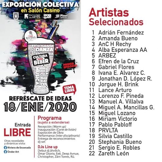 Estoy muy feliz porque una de mis fotografías fue seleccionada por el colectivo Ünder Art para una exposición colectiva de nombre "Cultura para beber". Se inaugurará en el Centro Cultural Riviera, de Ensenada, el 18 de Enero, y la entrada es libre. Mi mayor felicidad es estar rodeado de tantos talentos. Más adelante daré más detalles, como la hora de la exposición. Pero también habrá música y otras actividades. ¡Nos vemos ahí!