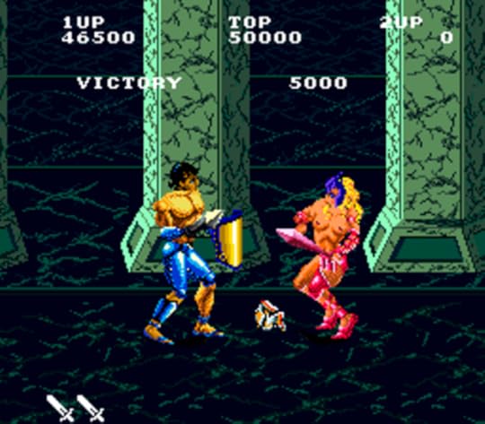 Pero había un juego que yo recordaba pero nadie identificaba. Eras una especie de guerrero con armadura, espada y escudo. Era un side-scroller. Tenías la posibilidad de subir y bajar tu escudo para bloquear ataques, pero si recibía mucho daño tenías posibilidad de perderlo. Si no te cubrías algún golpe, y te daba en la armadura, perdías esa pieza y tu piel quedaba expuesta. Un solo golpe en tu piel desnuda significaba la muerte. Recuerdo bien que había algunas guerreras, y si las golpeabas "apropiadamente" podías exponer sus senos. Totalmente pixelizados, pero a unos niños morbosos de los ochenta no les importaba, al final de cuentas eran senos. Yo recuerdo que las gráficas se veían sumamente realistas, los personajes me parecían enormes en la pantalla. Claro, estamos hablando de una época en donde los monitos que aparecían en el juego tenían el tamaño del Pac-Man.