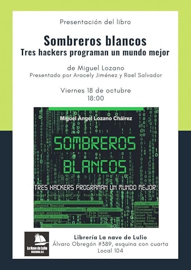 Están cordialmente invitados a la presentación de mi primer libro: "Sombreros blancos: tres hackers programan un mundo mejor". Lo presentaré en una librería nueva llamada "La nave de Lulio" que se encuentra en la calle Cuarta y Obregón. La cita es el viernes a las 6 p. m. Espero que puedan ir, estará interesante, y como siempre es una oportunidad padrísima par ahablar de estos temas.