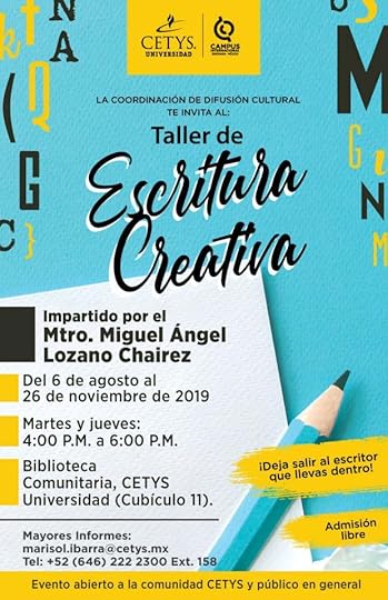 Están cordialmente invitados a este taller gratuito de escritura creativa, que inicia precisamente mañana, en las instalaciones de CETYS Universidad Ensenada. El semestre pasado también lo impartí, y fue una experiencia altamente enriquecedora, la química del grupo fue buenísima y una de las asistentes ganó un concurso literario. Esperemos que este semestre también se repita.
