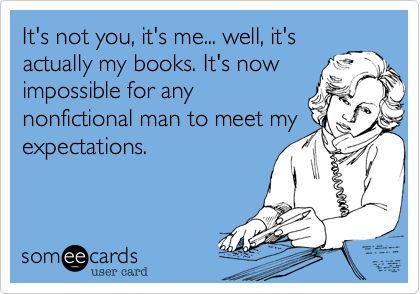 So, here's the thing: I ran across this meme a while ago and it's SO true. It stated that we fall for these literary characters who in real life would need some serious help. In some ways, it kind of bugs me, because many of the guys/gals that fall into the love interest category have massive issues. Or the relationship is bordering on abusive (or is just abusive outright (*coughTwilightcough*). Another one is where they move so damn fast into things that I find myself going WTF? They met YESTERDAY. And they are sleeping together/planning marriage/running away together/something else that seems rash and irresponsible.