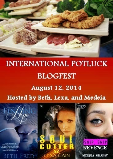Real quick: the wonderful ladies over on Author Tracker have an awesome review of Surrender the Sky up on their blog. Swing by and say hello? :)Lexa Cain, Beth Fred, and Medeia Sharif are hosting the International Potluck Blogfest. Here are the rules: