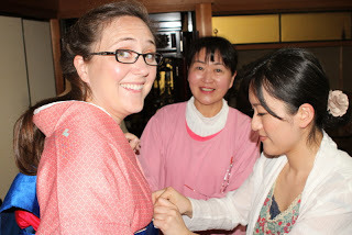 A good friend of ours, who studies traditional kimono, invited us over to her house and showed us how to dress in kimono. Holy moley is it an involved process! She then dressed me up in one of her kimono. This is me with her, and her mom (who plied us with sweets from her family's sweet shop downstairs--sooo good!), getting dressed.