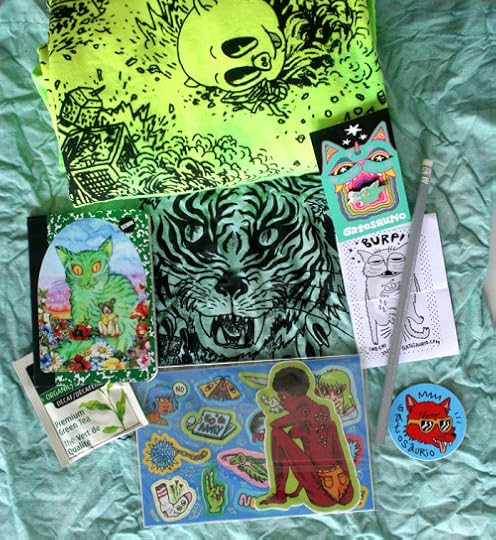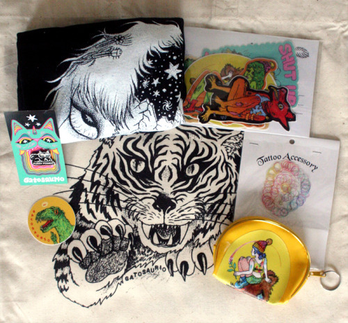 Gatosaurio Grab Bags! Each includes one suprise tee, sticker pack, tote bag and enamel pin plus more surprises like zines, 90s tattoo chokers, a pocket notebook or a coin purse!