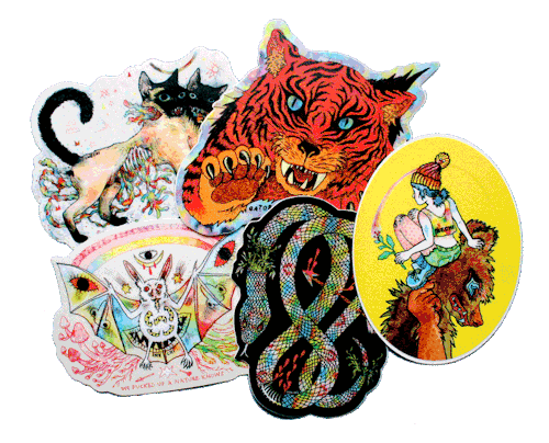 Gatosaurio Grab Bags! Each includes one suprise tee, sticker pack, tote bag and enamel pin plus more surprises like zines, 90s tattoo chokers, a pocket notebook, a coin purse, or something else!
