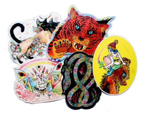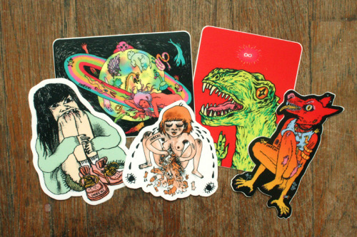 Gatosaurio stickers collection 2015 Printed in the USA on 0 waterproof vinyl, with designs by Inés Estrada (that’s me!), Ginette Lapalme, Sam Lyon / Jelly Gummies, Koyamori, Jen Lee / Repoghost and Simon Hanselmann / Megg, Mogg & Owl. New designs coming for 2016 ; )