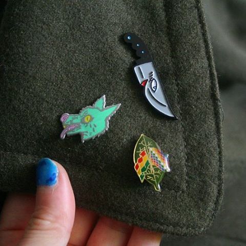I’m releasing my first enamel pin this week!!! Here’s a peek of it with a knife pin I got from Bred Press and a pin I got in Bolivia