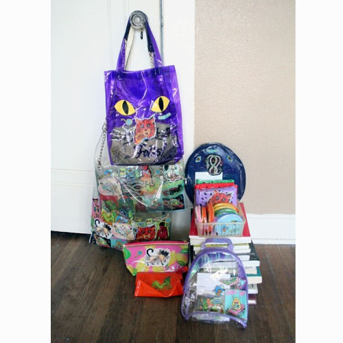 These are all the special bags I will have for sale today at VIERNES (CSA, 304 Blanco Rd. SA TX) and on sunday at Domingo (Friends & Neighbors 2614 E. Cesar Chavez, A TX). They are cool plastic hand bags and purses we’ve found thrifting and that we pimped with my vinyl stickers. All bags come with special gifts inside! Prices vary from $5 to $25. Leftovers will be available online next week at www.gatosaurio.com …if there are any!