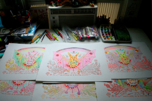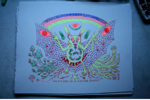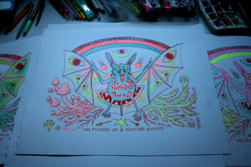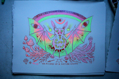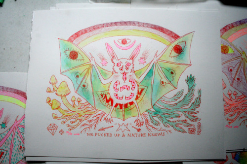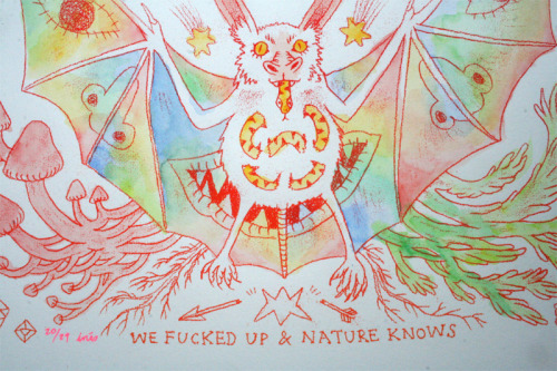 “We fucked up and nature knows” Edition of 29 unique prints, hand painted, numbered and signed by Inés Estrada. Screen printed with the help of Pierre Ferrero during PFC in Minneapolis, US 2015. Most of them can be enjoyed best at sunset or with a UV light. Available at Gatosaurio
