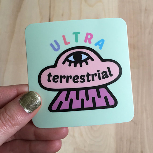 Becca Kacanda’s label, Ultraterrestrial is certainly out of this world. Out of her vibrant artwork she makes stickers, buttons, pocket mirrors and jewlery. What I like about her stuff it’s that it is cute, but also emanates a positive sense of consciousness and power. Her style is fun and bold, and also feminine and mystical. I interviewed her to know more about the workings of her mind…