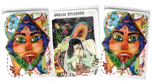 3 Inechi sticker packs, 2 2015 Calendars (1 for you, 1 for a friend), Ojitos Borrosos, Exitstance, Gang Bang Bong 2, Hate Soup, Xarman and the Patrick Kyle Stickerzine. Plus: 3 zines from our personal collection (could be from Mexico, Europe or the States), 3 random Inechi prints and a bundle of Inechi postcards and more fun junk!