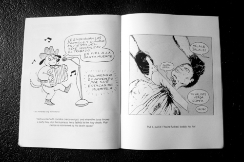 Hate Soup compiles comics and illustrations about the mexican drug cartel’s horrific practices of torture and dismemberment. These atrocities, filmed in video by their perpetrators, have been documented as insanely detailed drawings by Edwin throughout the last three years. This zine also contains a comic about an alien dominatrix and a man who has psychotic fantasies, plus a couple of funny illustrations of narcocorridos.
