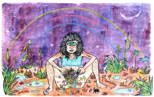 A weird commission I just finished. The premise was “A coloured self-portrait of inés as a cyclops in her factory workshop of imagination? if any sky or theme is present, it is night.”