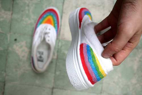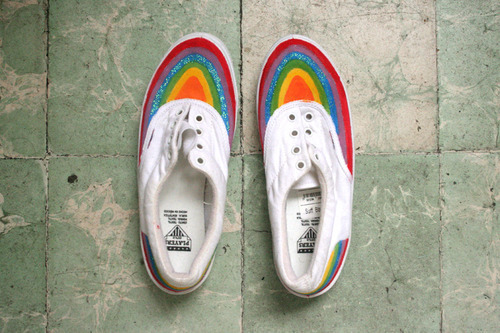 I found this rainbow sneakers that I painted for myself like 2 or 3 years ago. I’ve never worn them, so they’re brand new. The colors are very bright and the blue has glitter! The paint I used is acrylic for textile and won’t wash away with water.