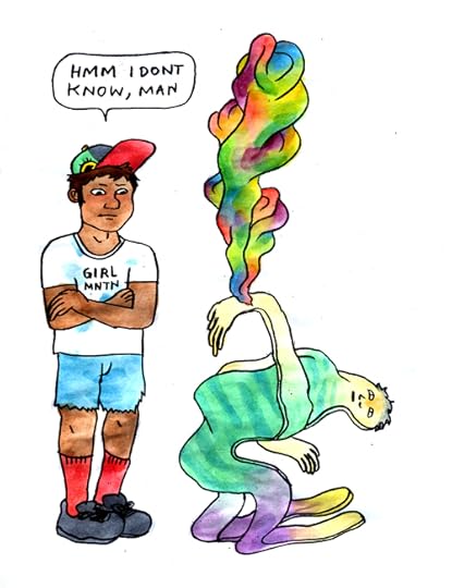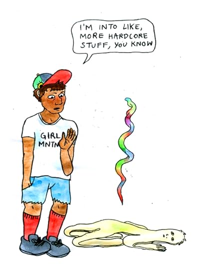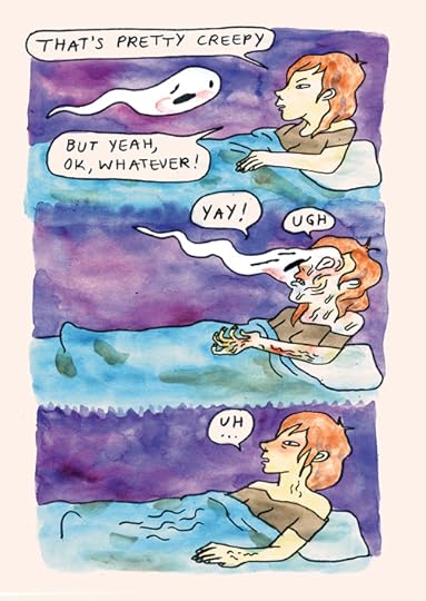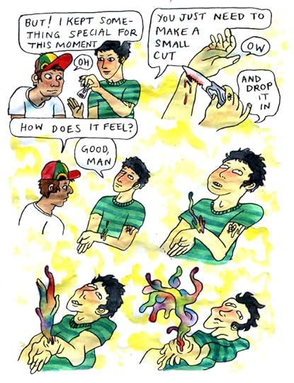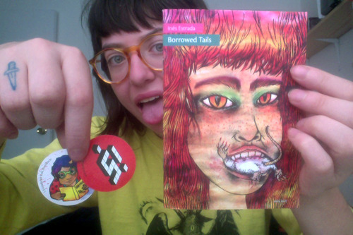 Borrowed Tails, a collection of brief narratives from Mexico’s Inés Estrada. The basis for these shorts are snatches of overheard conversations, though whether real or imagined is left to the reader’s imagination. A sort of distorted psychedelia prevails in these rapidfire tales which is emphasised by Estrada’s vivid use of colour and vibrant, often unnerving visuals. Sexually frustrated ghosts, the travails of the malodorous Skunk Girl, and a wasp sting-induced metamorphosis of a most radical nature (below right) are just some of the fantastic flights of fancy on offer here.