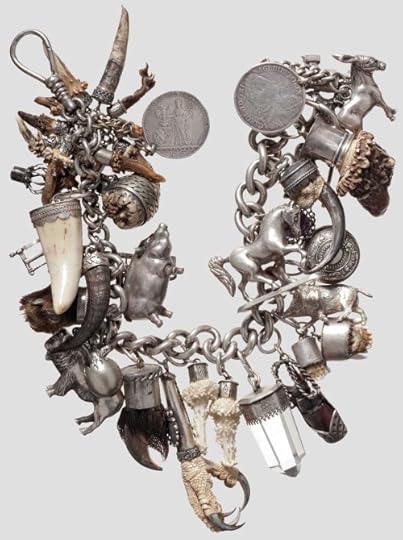 Konisch verlaufende, schwere Silberkette mit seitlichen Karabinerverschlüssen sowie zwei rs. mit Haken versehenen Münzen. Anhängend über 40, größtenteils in Silber gefasste Teile. Darunter Mardergebiss, Hirschkäfer, Adlerkralle, Rehgehörne, verschiedene Tiere und Werkzeuge aus Silber, usw. Breite ca. 55 cm.