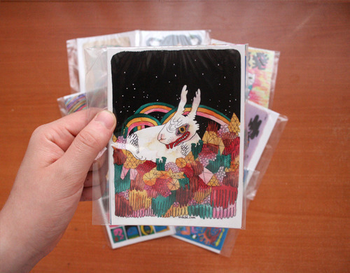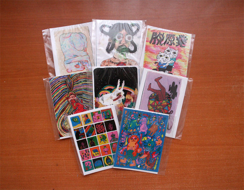 new postcard packs! each comes with 4 glossy postcards + 1 sticker.. get them and send them to your friends!.. or be a greedy bastard and put them on yr wall ; - P