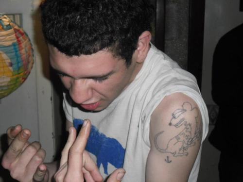 i stick n poked that rat tattoo on my friend roi a couple weeks ago.. it’s pretty funny …he has a beer bottle in his hand (but you cant see it here). more pics coming soon? maybe?
