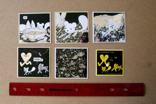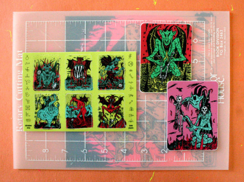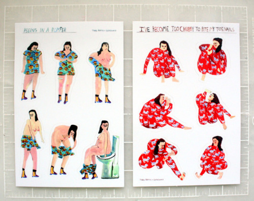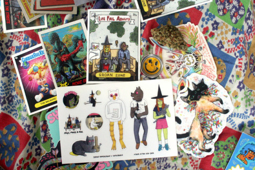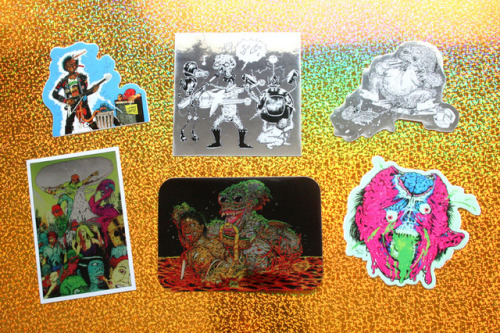 All of the water proof vinyl stickers currently available at Gatosaurio! From top to bottom, designs by: Inechi, Hervionono, Simon Hanselmann, Koyamori, Heather Benjamin, Tara Booth, Carly Schmitt, Michael DeForge, Abraham Díaz and Ginette Lapalme.
