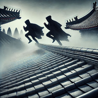Together the two black figures glided away. Smaller and more agile than their pursuers, they moved with cat-like quickness, leaping from roof to roof. In seconds, they had left them far behind. Moving to the edge of a roof, they slid down the drainpipe to an alley off a little used side street.