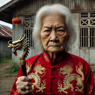 Standing at the top of the stairs was a stern looking old woman. Her black hair was streaked with gray and drawn back in a bun. She wore a scarlet silk robe, embroidered with gold thread. Piercing black eyes bored into Ben and Mailynn as they walked up the stairs. She stood straight and stiff, displaying no need for the polished bamboo cane she held in her left hand. As the children approached, heads bowed, her wrinkled face showed no emotion.