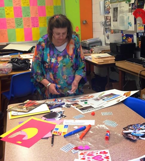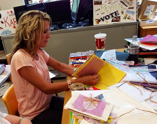Tabitha Keen binding a book.The week was filled with learning new ways to add more writing into our classes. It didn't matter that our group ranged from Pre-K teachers to 7th grade civics, we all found activities that could be adapted to our grade levels and subject area. After all, no one can take a paper towel roll, empty oatmeal containers, yarn, glitter, and glue and produce a masterpiece like a teacher.