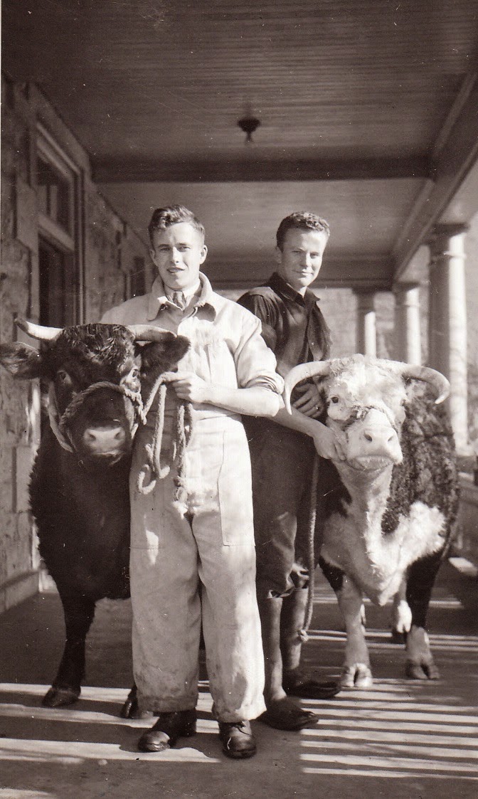 You probably can't see it, but they are standing just outside of . . . well, read on . . . Dad was a veterinarian.He received his education at the University of Guelph in Ontario, Canada.It was an . . . interesting three years.For everyone involved . . .In the spring of each year, everyone in the area geared up for the much-anticipated Little Royal Agricultural Show. There were numerous displays put on by all three colleges in the area: The Vets (My Dad’s group) from Guelph Veterinary College, the Aggies from the Ontario Agriculture College, and the Mac Hall girls from the MacDonald Institute for Women.There was also a show of livestock right on the campus.Being a Hereford enthusiast, Dad chose to show a Hereford cow. Two of his classmates chose similarly and the three of them spent most of their evenings working with their animals, gentling and training them.A week before the show, they decided that their animals had worked hard enough to have earned a little R and R (Rousing and riotous fun).Because . . . Dad. I'm sure I don't need any further explanation . . .The quiet, gentle animals were led out into the compound.All was well.The boys led them around the campus.Still good.Finally, they led the cows up the stairs and into the humans’ residence. Happily, the animals trotted along behind.The three men and their ‘exhibits’ circled the hall to loud acclaim, (Okay, there was a lot of shouting and laughter, I’m going to call it ‘acclaim’.) and started back toward the door.Which suddenly became blocked.By the Dean of Men.Oops.For a moment, the three boys and their Dean simply stared at each other. Then, without a word, the Dean backed away and let them out onto the porch.After a quick couple of pictures there (What event doesn't need to be recorded – or proved?), the cows were meekly led back to their barn and re-in-stalled. So to speak.For a week, Dad walked about gingerly, expecting at any moment to be called onto the Dean’s carpet.Nothing happened.I guess because the cows didn't leave anything on the dorm carpet, the Dean was happy to overlook the whole episode.Then, too, he probably knew my dad . . .