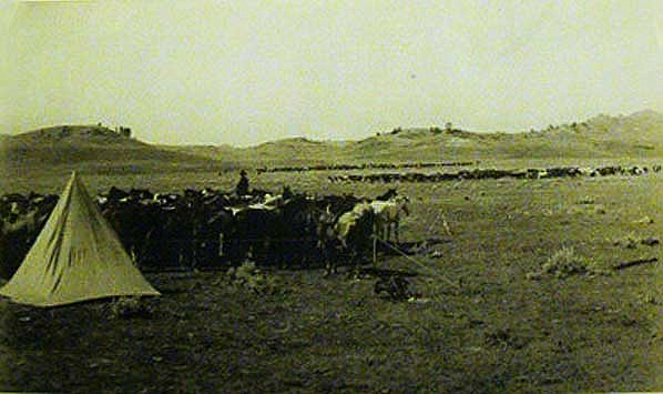 Photo CreditRope corral.Along in July or August of 1918, my father [George L. Stringam] sent Bert Quinton and I along to the roundup to bring back the strays.We were awakened at 4:00 AM by the breakfast bell.The night herder had already brought in the saddle horse herd and put them in a rope corral. (A rope was tied to short posts about four feet off the ground and was just large enough to hold a crowded horse herd.)Each cowboy came out to rope his horse. No one was allowed to swing a loop over his head for fear of frightening the horses. All horse roping was done from the outside by a back-hand throw and the horse was then worked around to the drop rope gate and out of the corral.I watched one young fellow saddle up his horse and [before mounting] walk him around for a while to get the kink (hump) out of the horse’s back.[A little aside here: Many of these horses were newly-broke and still didn’t like the idea of having something strapped to their backs. For the first while, they would protest in any way they could. Usually by arching their back up, perhaps to try to get the saddle as far away from themselves as they could!]Gradually, the hump subsided and the horse seemed okay.Now, about ten feet below the corral, in a small depression, was a large spring where the cook came for water. This spring was fenced to keep out the livestock.Once the young fellow was aboard (mounted) the horse started to buck, heading straight for the spring.He came to a sudden stop as he hit the fence.The cowboy didn’t.Nothing like a cold, refreshing bath before the start of the workday.