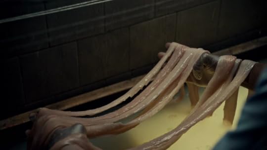 The soft-focus montage of stringmaking plays out over an unusually harmonious bit of music, making this particular process of dismembering people and repurposing their bodies an oddly pleasant, idyllic thing. It is worth contrasting with Blake’s The Marriage of Heaven and Hell, in which his (non-murderous) printmaking process is detailed as the workings of “a printing press in hell,” whereas here infernal content is presented in more sacred terms.