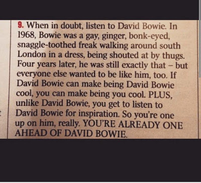 But David Bowie has got me thinking of much deeper issues than just admiration of amazing talent, though he had that in spades, also. The way he approached art and himself. Never willing to settle. Always wanting to try something new. Growing from it and then outgrowing it. And then onto the next endeavor. People have called him a chameleon, but I think it was braver than that. He didn't adapt and change to what was going on. He ignored what was going on and thought, “What do I want my next iteration to be of me as an artist? What do I want to try? And then the world followed. Even that mullet... 1973... the mullet would become a thing in the early 80s... He led. So far ahead that most people couldn't even see it.