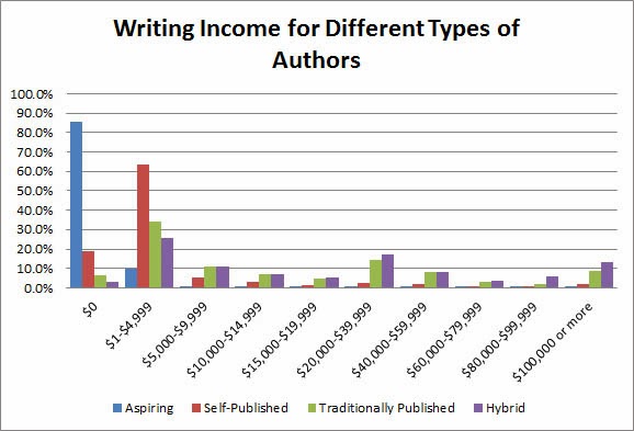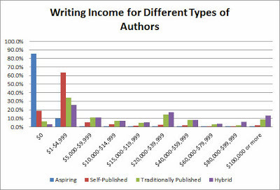 These are all percentages, so it gets a little hard to know what is what in real numbers... I assume there are MANY more aspiring writers than published writers, though self-publishing makes crossing that bridge a lot easier... so N for aspiring is biggest, followed by self... but I have NO CLUE how traditional and hybrid categories compare.