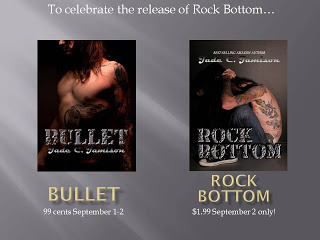 September 2: Jade Jamison (one of my reliable sprint buddies and first readers for my Shot in the Light Series) Is releasing Rock Bottom, sequel to the Best-Selling Bullet . Note for the release weekend, Bullet is only 99 cents--these are rock and roll... I want to say love stories... they are, but NOT typical romance... sexy (some erotica level scenes) but REAL... Your inner groupee definitely wants to read these.